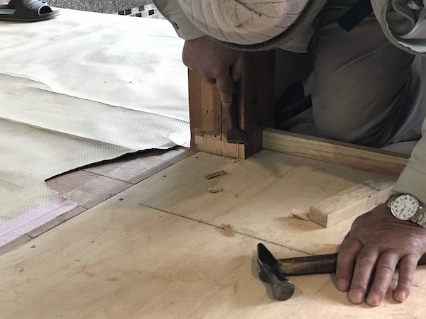 足元の敷居を外して廊下とリビングのフロアをフラットにしようとしています。