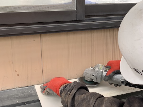 外壁の下をシールで塞がれていたため切り開けて隙間を作っているところ。