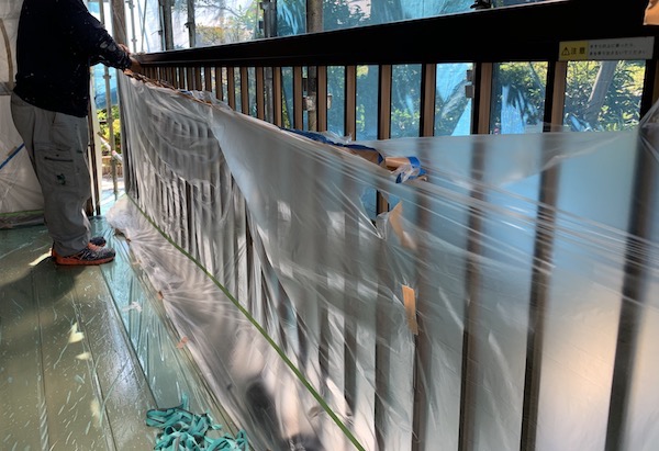 写真は、バルコニー手すりの養生シートをはいでいるところ。