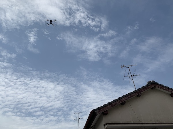 写真はドローンにて屋根の調査をしているところ。