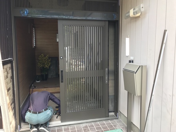 古い玄関扉を外して、新しい玄関を取り付けています。